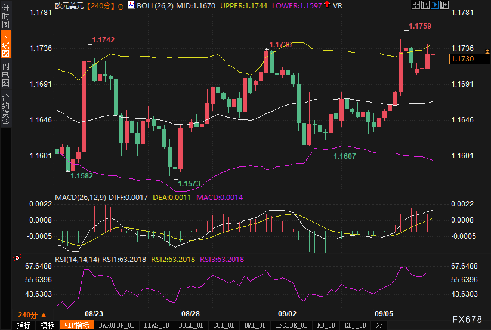 四小时图(240分)显示,汇价沿布林带上轨震荡上行,布林带中轨位于1.1670,上轨1.1744,下轨1.1597。短线价格贴近上轨一线,1.1738/1.1742/1.1759构成近期“前高密集阻力带”,上方抛压客观存在;下方则依托中轨1.1670维持上升节奏,进一步的静态支撑见1.1607、1.1582与1.1573。