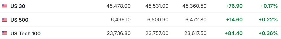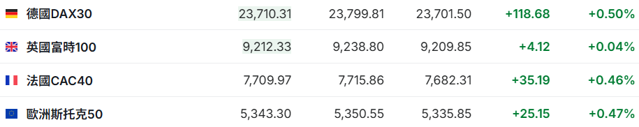 2. 截至发稿,德国DAX指数涨0.50%,英国富时100指数涨0.04%,法国CAC40指数涨0.46%,欧洲斯托克50指数涨0.47%。
