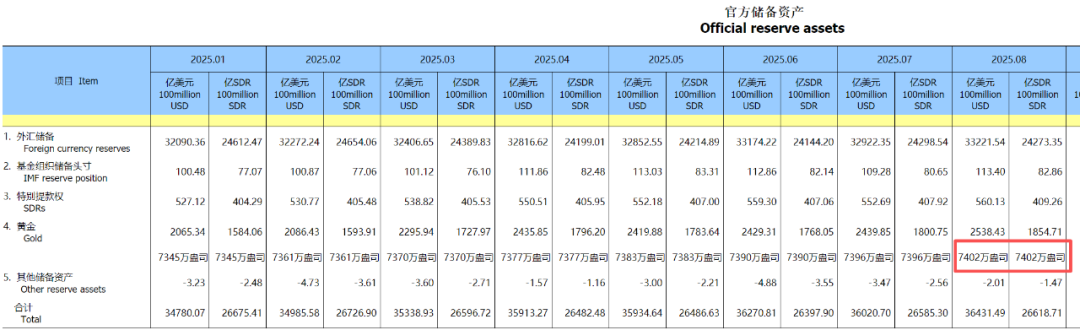 9月7日,中国人民银行官网公布数据显示,8月末黄金储备为7402万盎司(约2302.28吨),环比增加6万盎司(约1.87吨),7月末为7396万盎司(约2300.41吨)。央行10个月共增持黄金122万盎司(约37.94吨)。