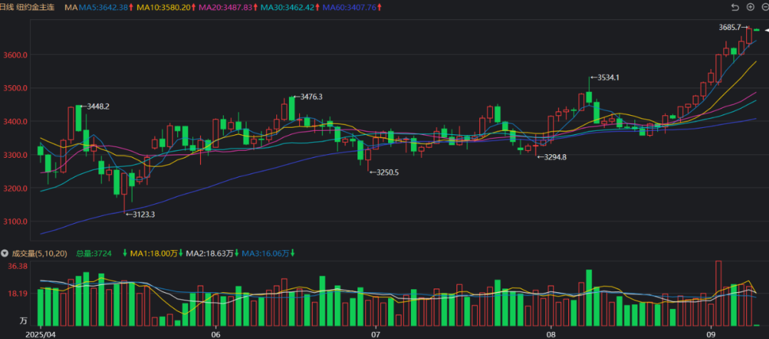 9月8日COMEX黄金期货再创历史新高,COMEX黄金期货盘中最高触及3685.7美元/盎司。截至当日收盘,沪金主力2510合约报收于822.86元/克,涨幅为1.02%。