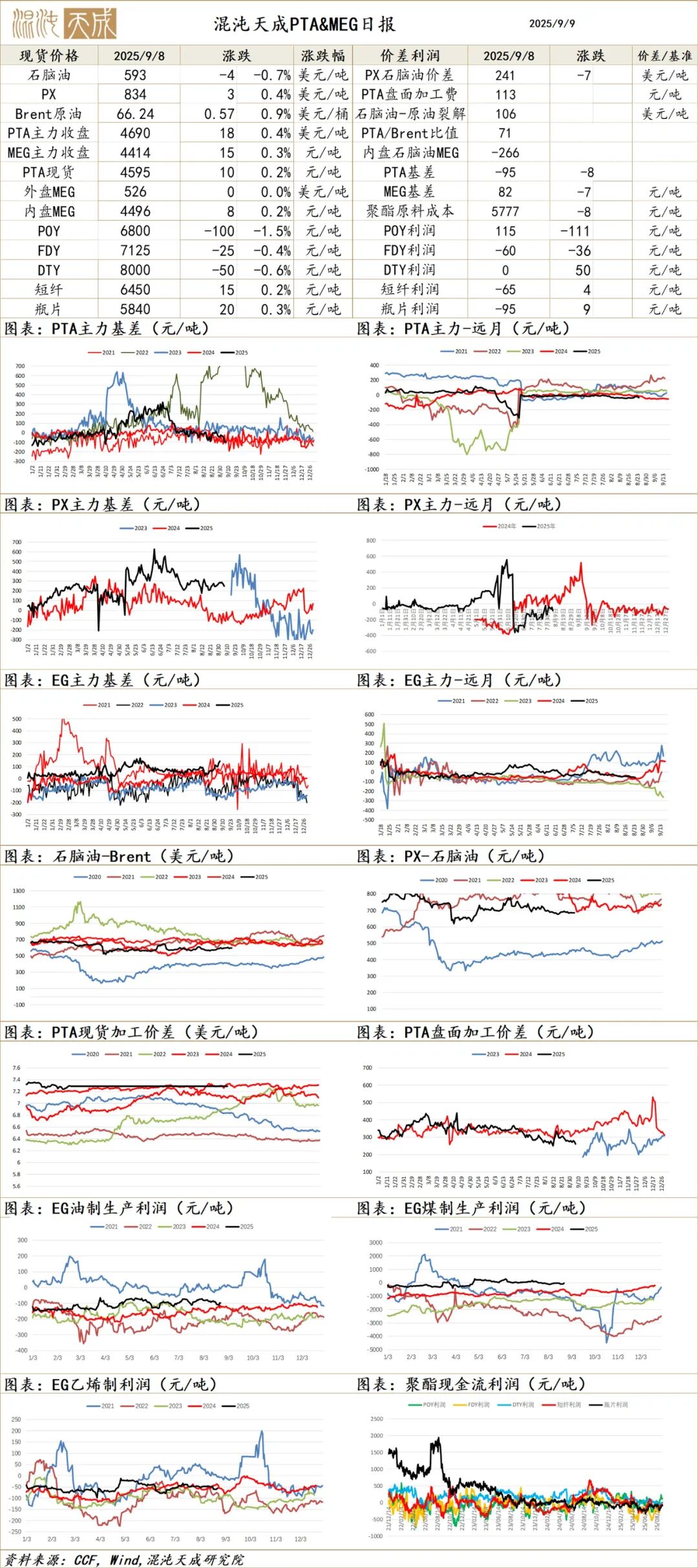 供应端:截止9.4日,PX开工小升至82.6%,中等水平,至年底仍有小幅上升预期;PTA开工升至74.3%;PTA高开工低加工费,但检修预期上升。