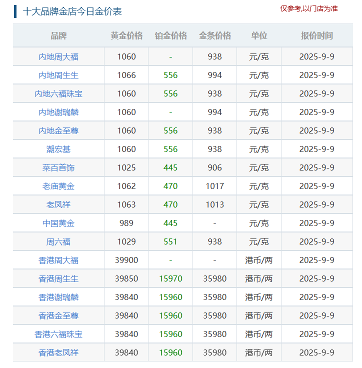 国内金饰品价格也有一定程度的上涨。周大福、周大生、六福珠宝、潮宏基等报价1060元/克,周生生高价最高1066元/克。据此前财闻的报道,9月1日国内黄金饰品周大福、周六福、潮宏基等金饰报价都回到四位数,报1027元/克,中国黄金报价最低969元/克。