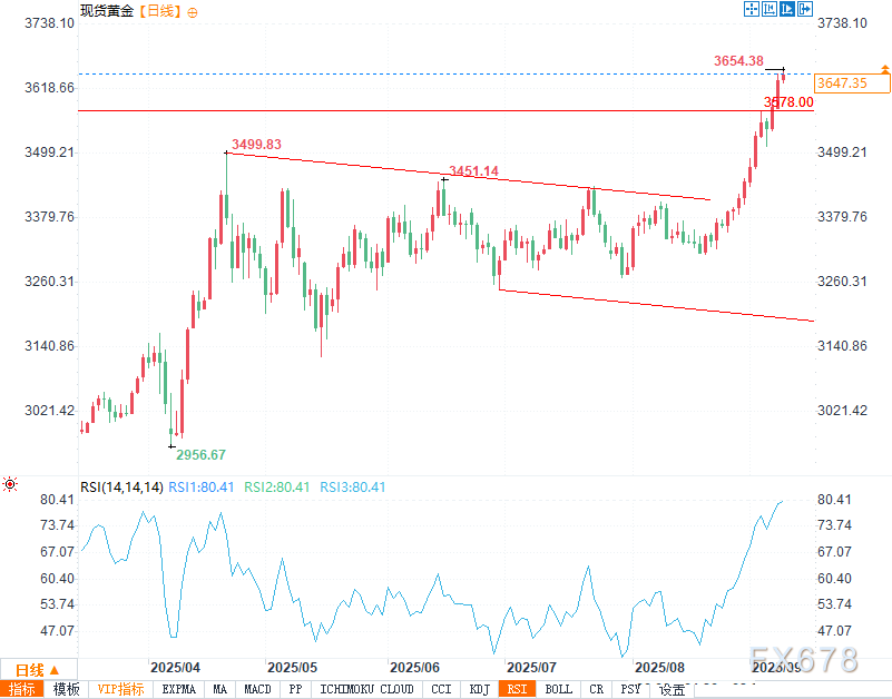 下行方面,初步支撑位于9月8日低点3578美元,其次为3550美元水平。买方最终防御线将落在3500美元心理关口。