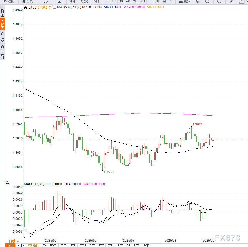 技术面显示,美元兑加元日线维持在1.3800—1.3850区间震荡,上方阻力位集中在1.3880和1.3920,下方支撑位在1.3760及1.3700一线。