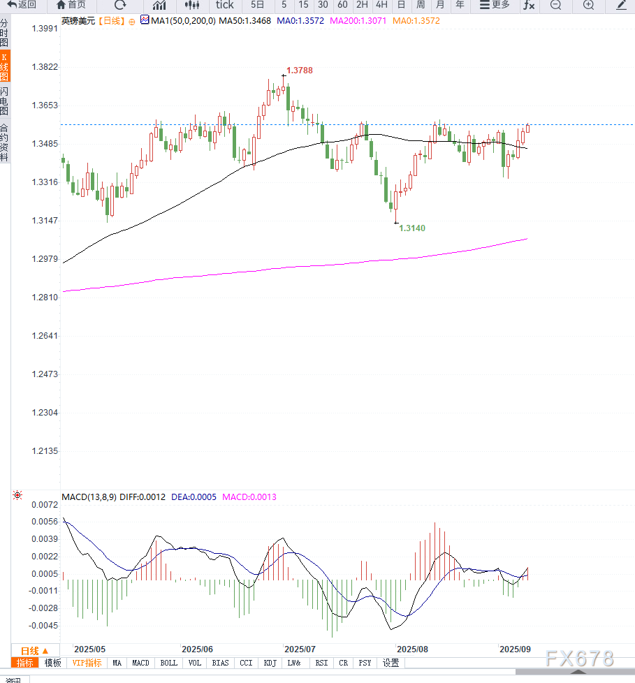 技术面显示,GBP/USD日线在1.3400支撑位上方稳固企稳,并突破了短期均线压制。MACD快慢线形成金叉,动能柱转向正值,显示多头力量增强。