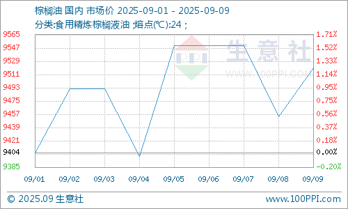 据生意社商品行情分析系统显示:9月开始,国内棕榈油行情涨跌互现,振荡上涨为主。9月1日,棕榈油市场均价9404元/吨,9月9日,棕榈油市场均价9520元/吨,价格上涨1.23%。