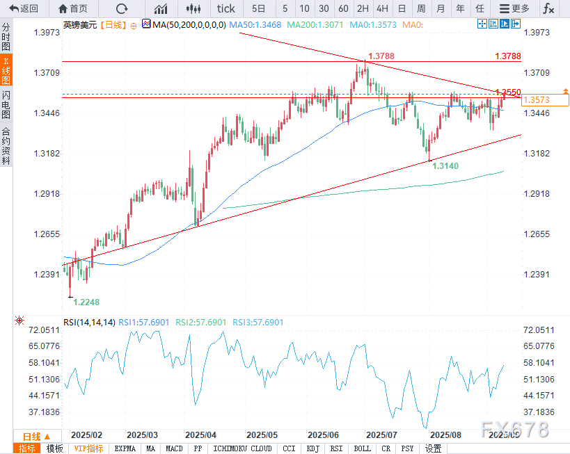 若突破8月高点1.3600关口,汇价将确立更高波动区间,后续焦点上看1.3700整数位及7月高点1.3800附近。