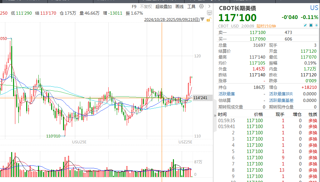 长期美债期货主力合约的价格也一度攀升至117.15美元,同样刷新今年4月以来新高。