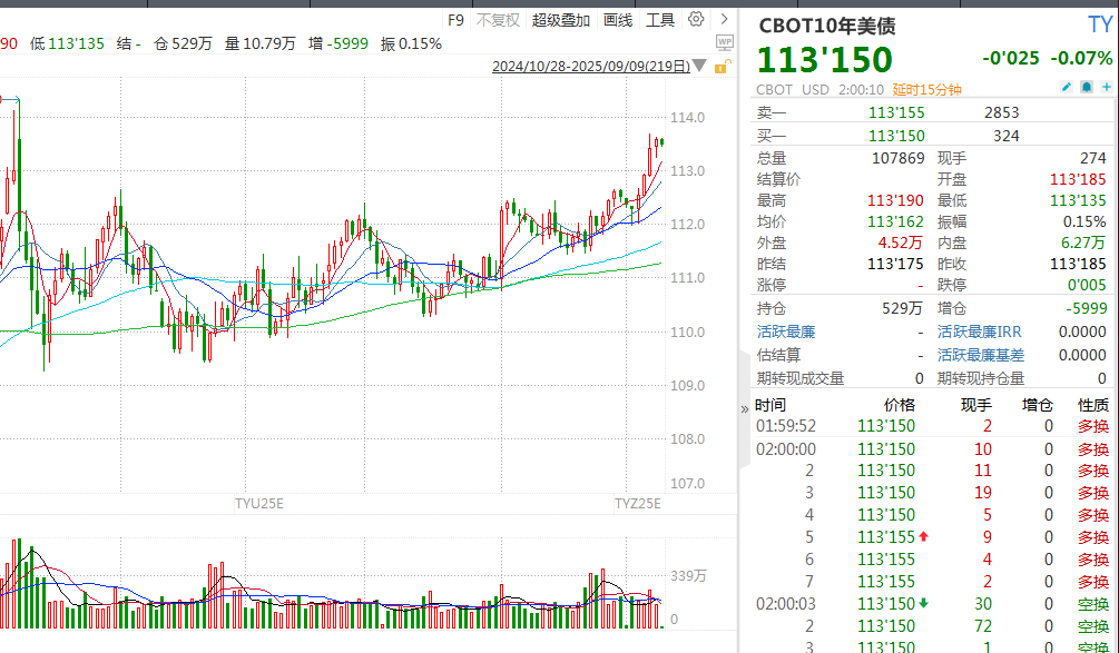 与此同时,美债期货价格接连走高,10年期美债期货主力合约的价格一度攀升至113.215美元,刷新今年4月以来新高。