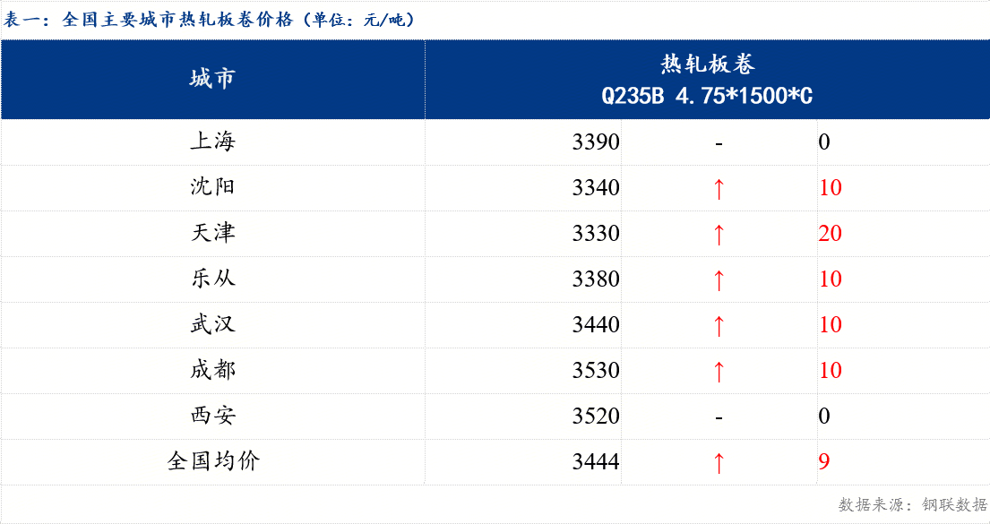 今日热轧板卷全国主要城市价格小幅上涨,午后成交转弱。截止发稿时4.75热轧板卷全国均价3444元/吨,较上一交易日上涨9元/吨。今日黑色系热卷期货价格先扬后抑,10合约收跌0.42%。