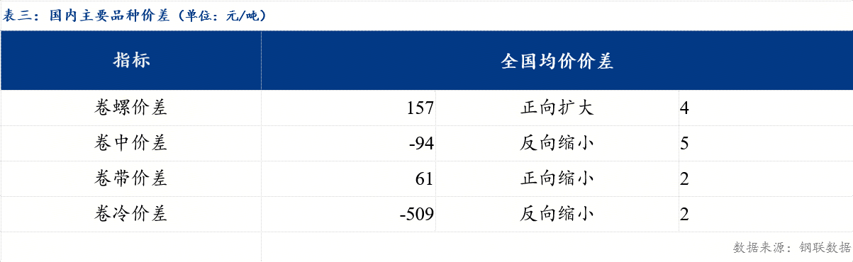 从品种价差来看,卷螺差较上一交易日正向扩大4元/吨,热中价差较上一交易日反向缩小5元/吨,热带价差较上一交易日正向缩小2元/吨,热冷价差较上一交易日反向缩小2元/吨。