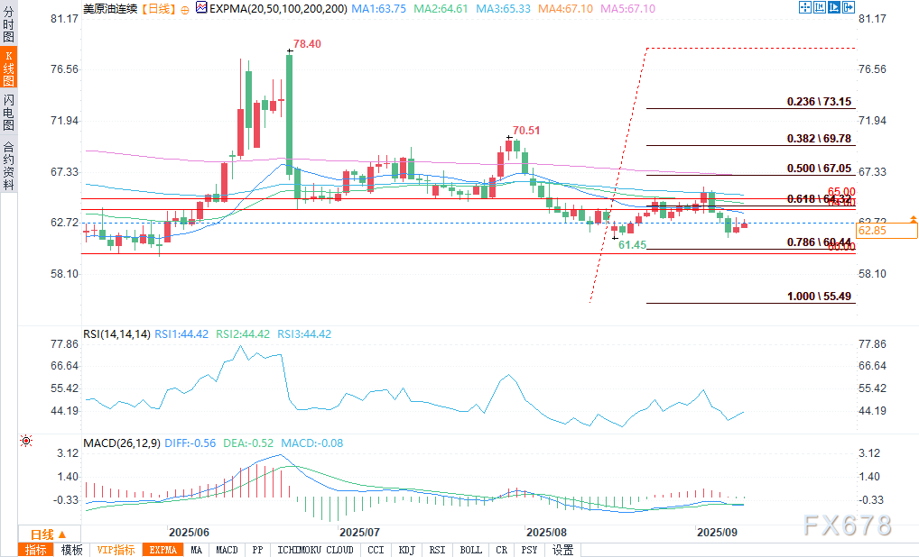 下行方面,即时支撑位见于61.45美元,主要支撑位在61.12美元。若价格跌破这一水平,原油可能面临重新测试5月低点56.09美元的风险——该位置是多头的关键防线。