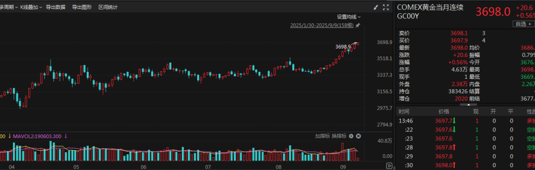 数据显示,截至9月9日记者发稿,COMEX黄金价格盘中再创新高,触及3698.9美元/盎司,8月中旬以来累计涨幅超过9%。自今年4月黄金价格大涨之后,金价经历了数月的盘整,直至近期再度走强,并重获市场瞩目。