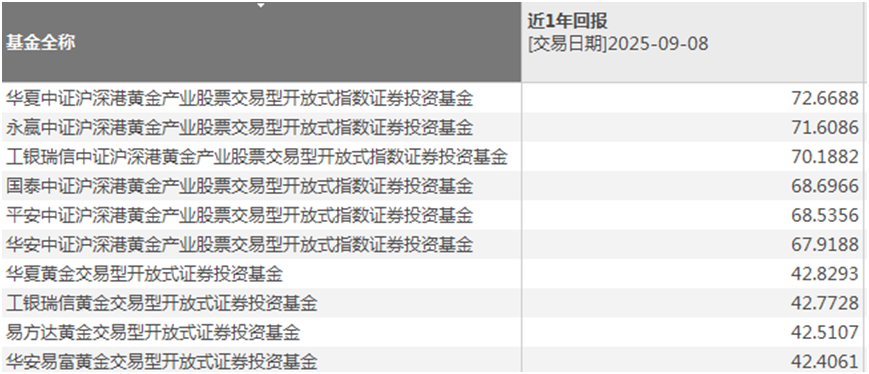 从近一年的净值涨幅来看,这类产品也给投资者带来较好的回报。截至9月8日,上述提及的3只黄金ETF近一年的净值涨幅超过70%,且市场上其他黄金ETF的同期涨幅均超40%。