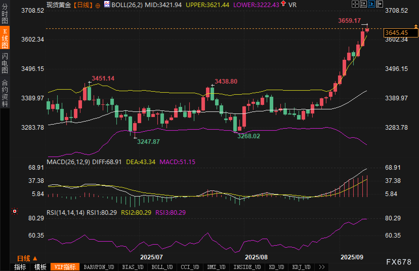 日线图采用布林带与MACD、RSI互相验证。价格已强势突破并沿布林上轨“走带”,上轨在3621.44,中轨3421.94,下轨3222.43;日内高点3659.17。布林带宽扩张,属于“量能前导+趋势加速”的阶段。短线第一道动态支撑位于3621.44,更下方为前高3438.80的回测位。上方空间在极值突破后的量化外推有限,3700可视作心理阻力区。