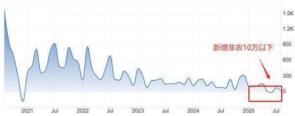 然而,2025年以来,美国的新增非农就业人口经常跌至10万人下方,且数值极低。8月份的2.2万人已经低到震惊市场,但今年6月份新增非农人口曾跌至负值,为-1.3万人,5月份也出现过低于2万人的数值。如果只考虑就业数据,可以推断,美国宏观经济已经陷入衰退,且衰退迹象已经非常明显。