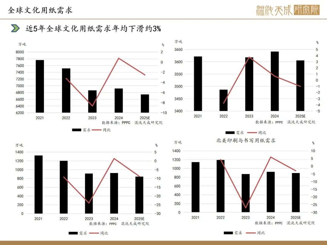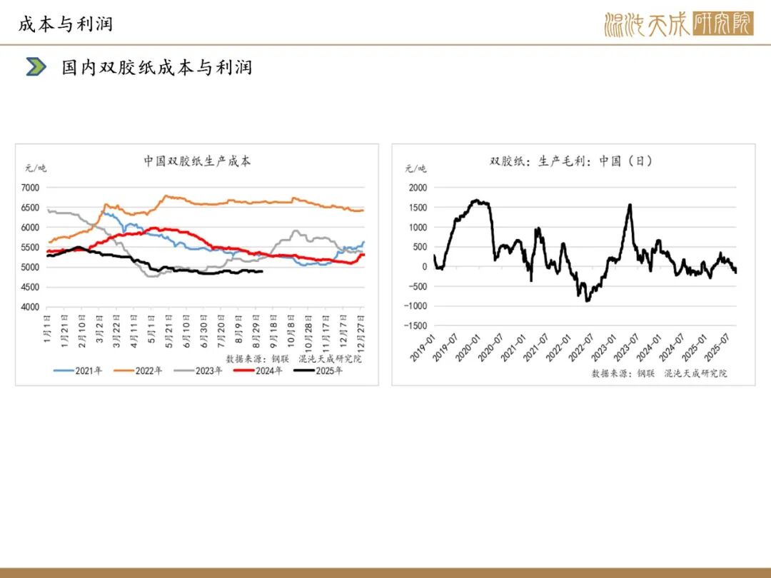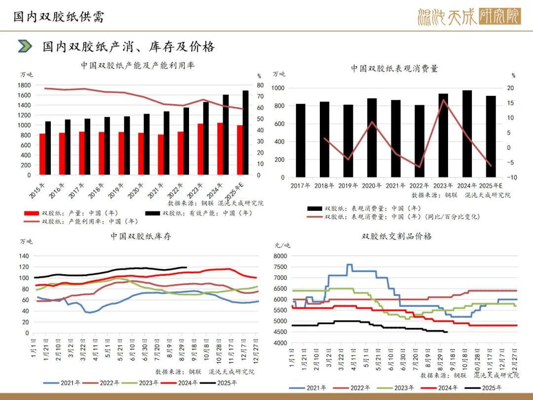 需求上,下游主要用于教辅教材以及社会图书(占比超过80%),随着电子化的发展,胶版纸需求有所下滑。从全球来看,根据PPPC数据,印刷与书写用纸年度消费量过去5年平均每年下降3%,2025年1-8月国内双胶纸表观消费量同比下降约6%。