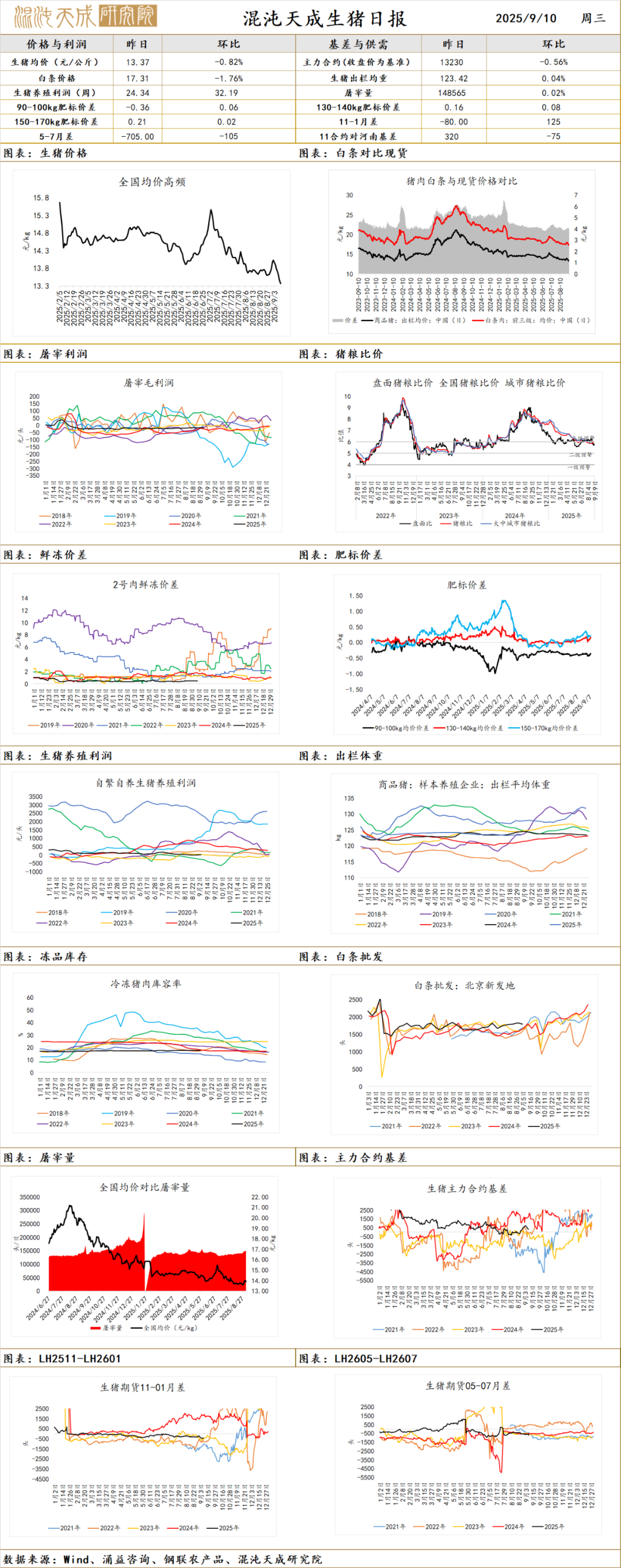 3.机构消息:据上海钢联重点养殖企业样本数据显示,2025年9月9日重点养殖企业全国生猪日度出栏量为258450头,较昨日上涨2.29%。供应不减,需求支撑有限,南北价格持续下跌,短期内供需形势难改,仍持续震荡偏弱为主。(钢联农产品)