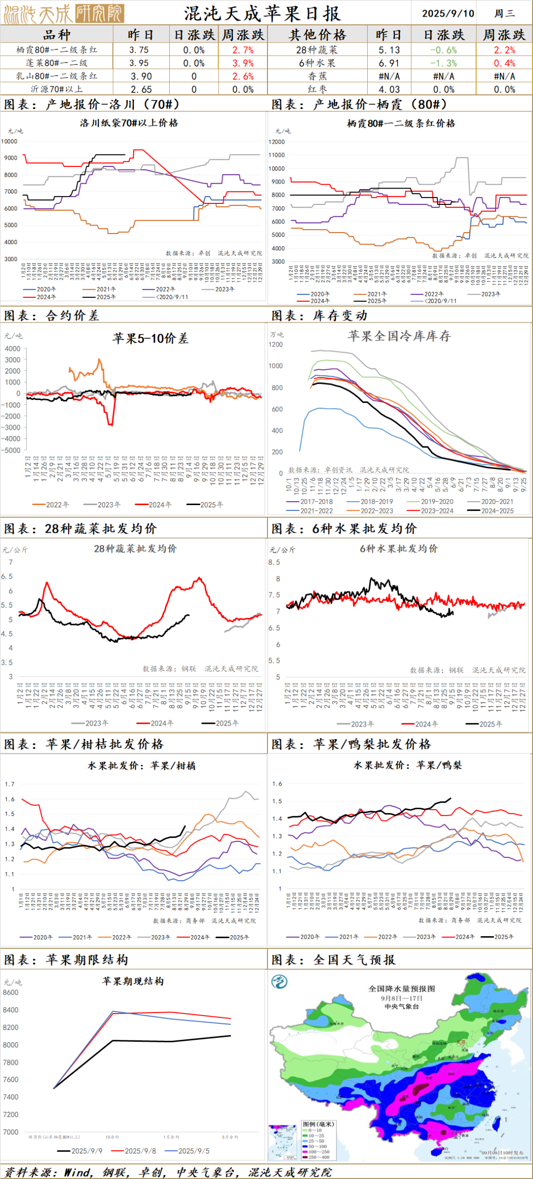 苹果:山东产区冷库苹果主流成交价格稳定,冷库存储商采购积极性良好,主要选购好货,一般质量货成交不多;西北产区早熟苹果客商采购积极性较高,成交良好,价格居高;市场到货平稳,近两日华南地区降雨频繁,市场出货一般,成交价格稳定;基本面变动不大,早熟价格维持高位,冷库好货价格偏硬,目前看新季晚熟富士果个偏小,基本面潜在利多仍存,传闻有部分产业套保,叠加期货加保险入场,短期交割博弈向下,下树前维持震荡,不宜追空,后期主要关注晚熟果品质量和早熟价格变动。