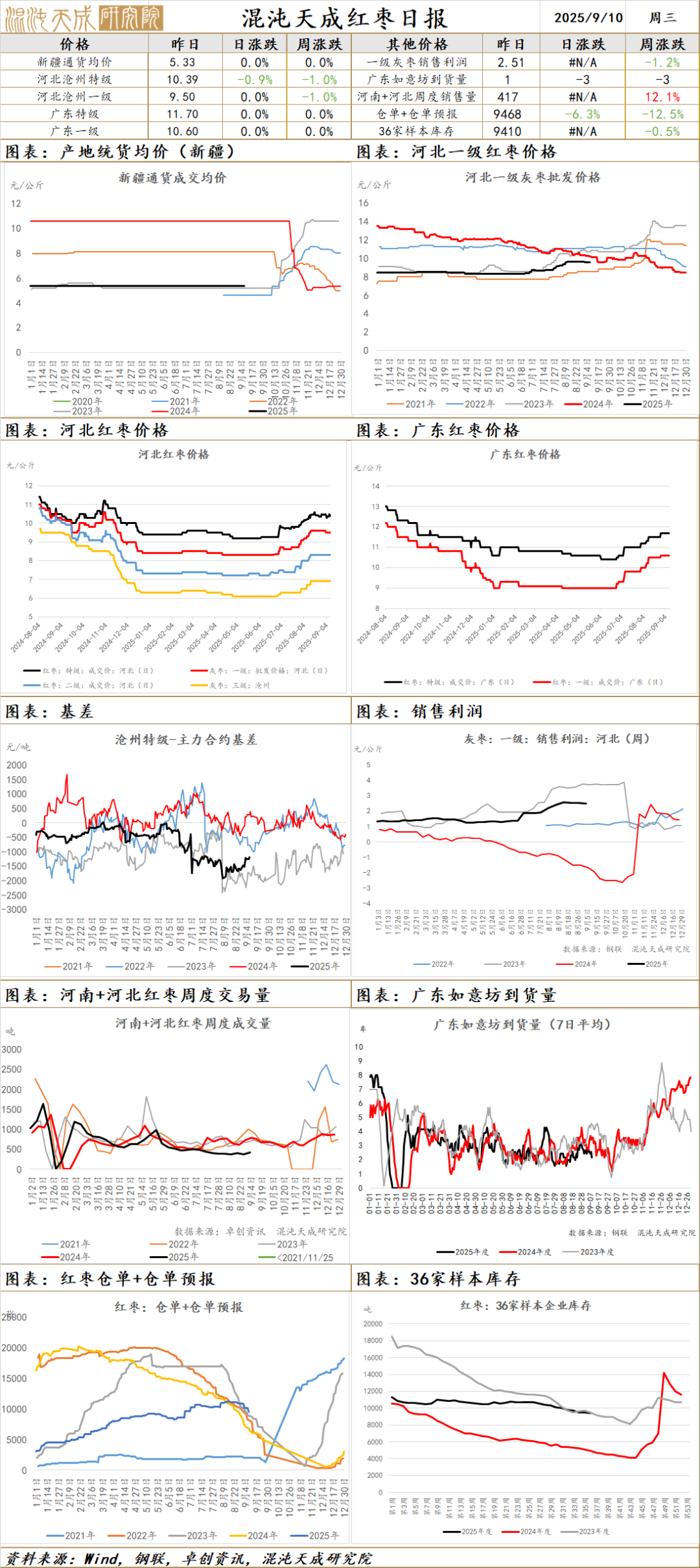 河北崔尔庄市场红枣到货1车等外,市场近期到货零星,客商自有货源成交一般; 广东如意坊市场到货1车,现货价格暂稳运行,客商按需采购成交一般;未来半个月产区天气预报降雨量较低,对产量担忧有所缓解;近期销区现货价格小幅走弱,旺季涨价预期也有所减弱;盘面破位下跌,供应端的炒作题材减少,目前还剩下开秤价的博弈,下树前可能仍存在反复,红枣维持逢高空的策略。