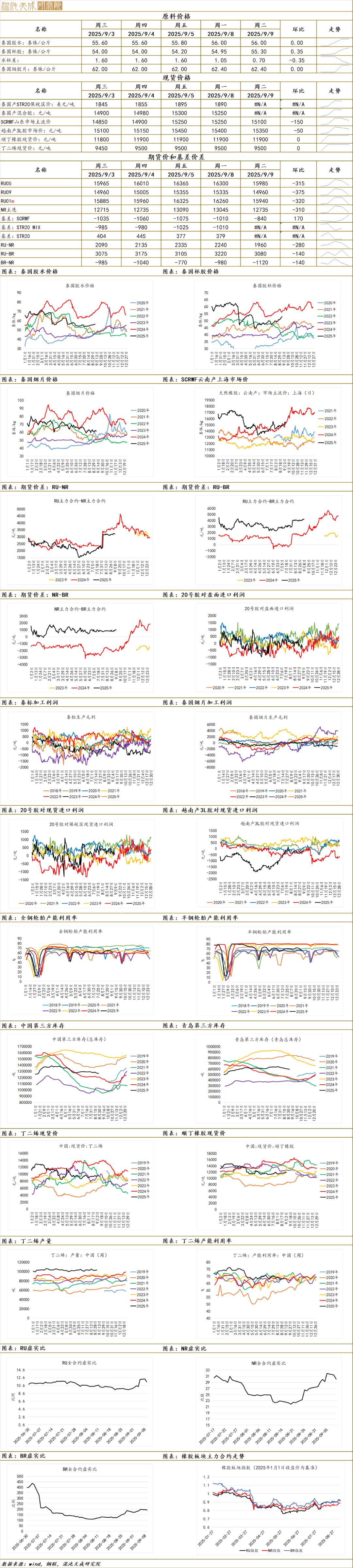 供给端,近期云南地区降雨环比走弱,景洪二盘出现单日满收,或从微观角度反应国内产区正在上量,但目前未见胶水价格走弱。国内进口方面,2025年8月中国进口天然及合成橡胶合计66.4万吨,较2024年同期的61.6万吨增加7.8%,相对来说增幅收敛,符合我们的预期,可能9月进口增量亦是收敛的情况,真正的上量或要到四季度。