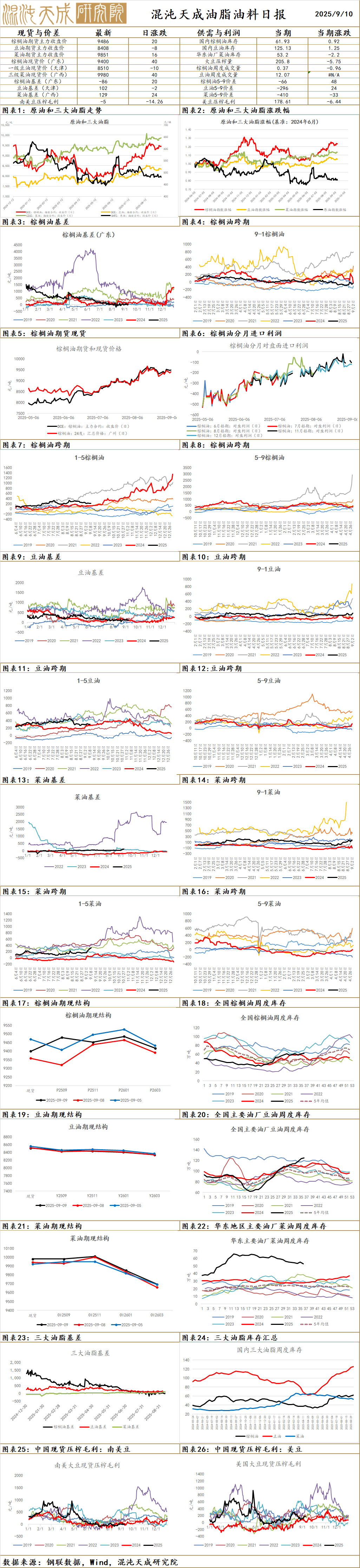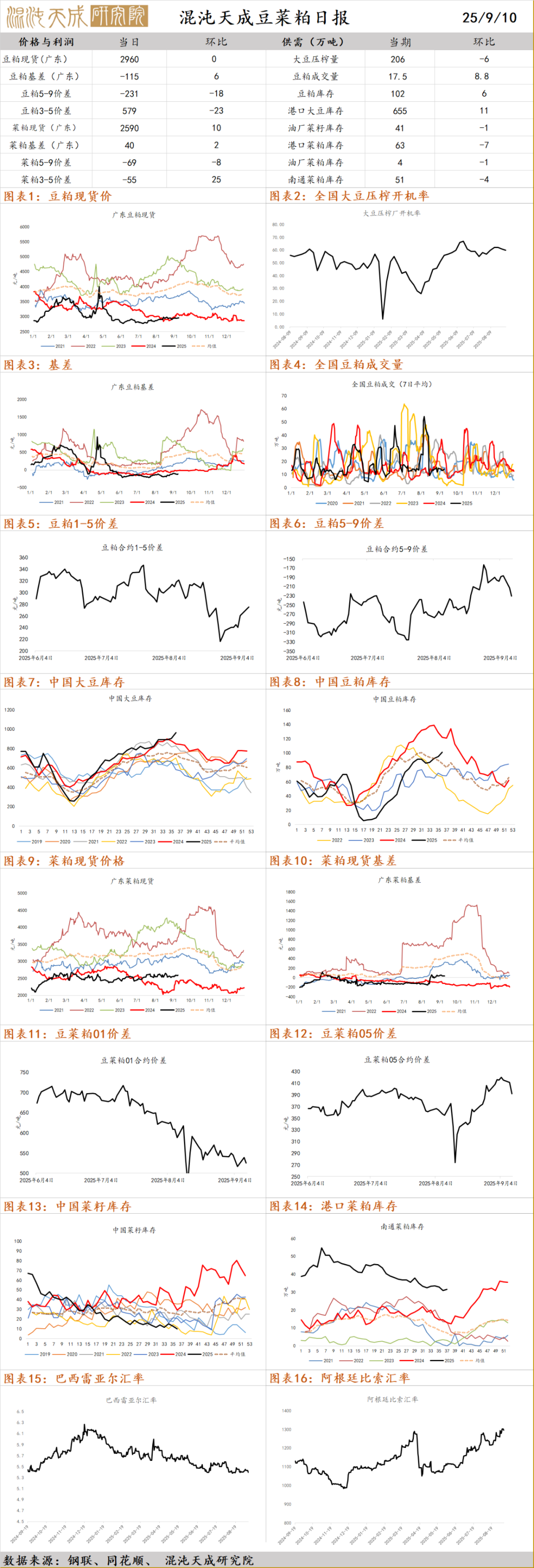 需求端:印度大豆加工商协会(SOPA)敦促政府将植物油的进口关税至少提高10%,并警告称,国内价格低迷正迫使农民放弃种植油籽作物;印度8月棕榈油进口量激增至99.3万吨,环比增长16%,创下2024年7月以来的最高水平,食用油进口总量环比增加3.6%,至160万吨,创13个月来最高水平;马来年底前启动可持续航空燃料生产、国内消费预期增加;印尼首席关税谈判代表:美国原则上同意将棕榈油、可可和橡胶排除在19%的关税之外,棕榈油、可可和橡胶有望从美国获得零关税或接近零关税的待遇;美国环境保护署(EPA):小型炼厂豁免涉及多个年度,总量约为53.4亿加仑可再生燃料识别号(RINS),2022年和更早的年份RINs不会影响可用于满足2024年和未来合规义务的RIN数量,预计不会影响对生物燃料的需求;有印尼贸易部官员表示,正要求棕榈油生产商遵守DMO计划保障本国每月17.5万吨的对内销量,前期月度对内销量偏低;印尼能源部数据显示,截至7月16日,印尼今年生物柴油消费量已达742万千升;印尼联昌国际证券(CIMB Securities)在一份报告中称,如果印尼政府实施B50生物燃料法规,则该国国内棕榈油消费需求料因此增加300万吨,相当于2024年该国毛棕榈油产量4820万吨的6.2%;据巴西国家能源政策委员会(CNPE)官员,巴西将生物柴油在柴油中的强制掺混比例从14%上调至15%;昨日新增买船1条,本周累计买船1条,本周国内棕榈油库存环比增加1.5%。