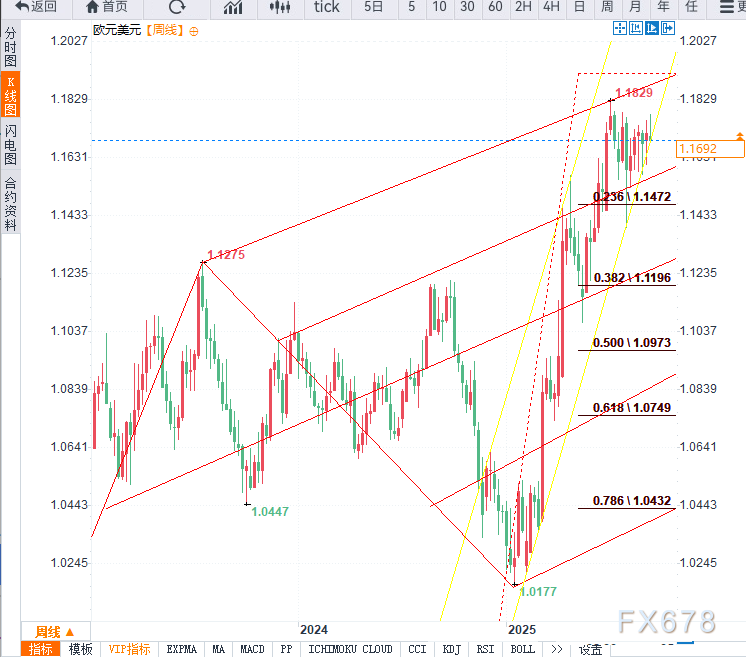 周线支撑位于7月周线最低收盘位1.1586,次要支撑为2020年3月/2022年高点1.1497——若汇价触及该区域需重点关注市场反应,有效下破或周线收低于该水平则暗示重要顶部形成或更大级别回调启动。后续支撑关注4月最高收盘位/7月低点1.1392/94及1.1164/99区间。