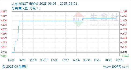 9月1日,生意社大豆基准价为4312.00元/吨,与上月初(4304.00元/吨)相比,上涨了0.19%。