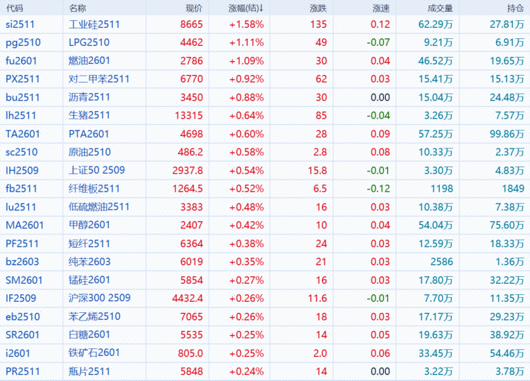 9月10日,午盘收盘,国内期货主力合约涨跌互现,工业硅、燃料油、液化石油气(LPG)涨超1%,生猪、对二甲苯(PX)、沥青涨近1%。跌幅方面,碳酸锂、多晶硅跌超4%,棕榈油跌超2%,焦煤、豆油跌近2%。