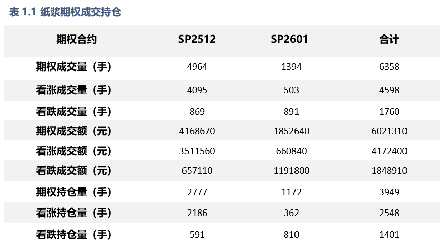 纸浆期权上市首日成交额为602万元,期权价格运行总体平稳,看涨期权交投略强于看跌期权。