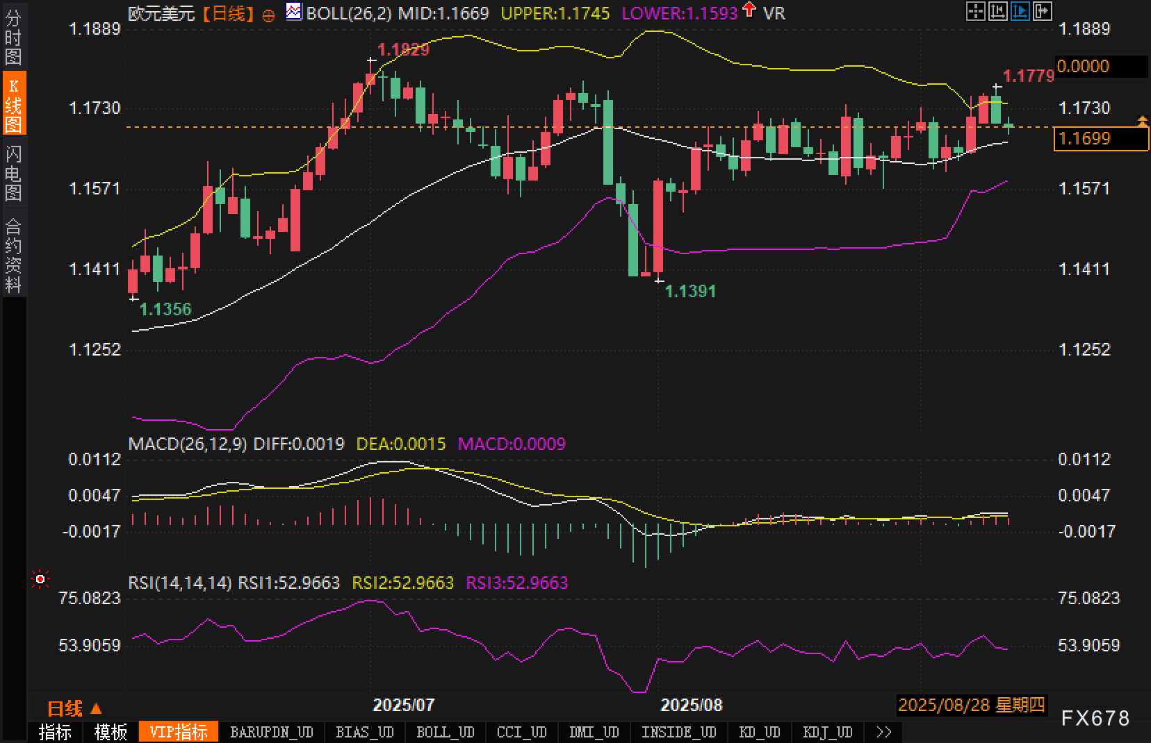 日线图所示,布林带中轨1.1669、上轨1.1745、下轨1.1593;当前K线实体靠近中轨上方,汇价正于中轨附近回测—拉锯。近期高点1.1779对应多周高位,前期低点1.1391/1.1356构成更中期的结构性支撑。MACD显示DIFF 0.0019、DEA 0.0015、柱状图0.0009,双线在零轴附近轻微金叉后趋于粘合走平,动能释放有限,呈横盘趋势特征;RSI(14)为52.9663,处于中性区略偏强,未见超买/超卖信号。布林带口径并未显著张开,提示布林带挤压尚未解除,波动率仍处于温和状态。