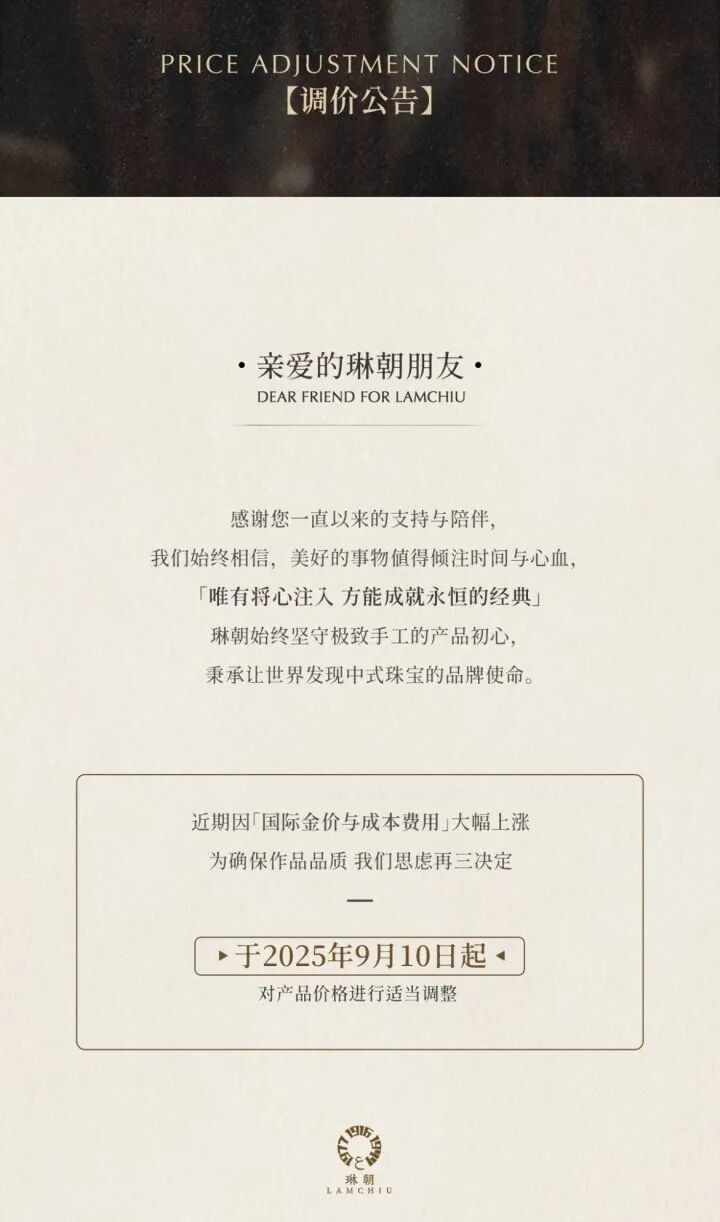 在几天前的调价公告中,琳朝解释此次调价的原因:“近期因国际金价与成本费用大幅上涨,为确保作品品质,我们思虑再三决定从2025年9月10日起,对产品价格进行适当调整。”