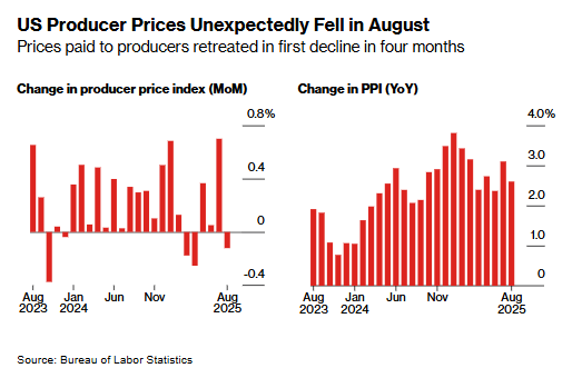 美国8月批发通胀意外出现四个月来首次下滑,这为美联储降息提供了更多依据。美国劳工统计局周三公布的数据显示,生产者价格指数(PPI)环比下降0.1%,且7月的数据向下修正。同比来看,该指数上涨2.6%。