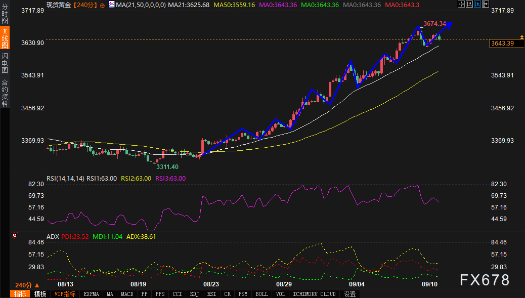 从4小时图来看,现货黄金的看涨结构持续延伸。自8月底在3300美元附近触底以来,金价形成了一系列“更高高点”和“更高低点”的阶梯式上涨形态。本轮涨势的最新阶段已将金价推升至3650美元区间,并创下约3675美元的历史新高。