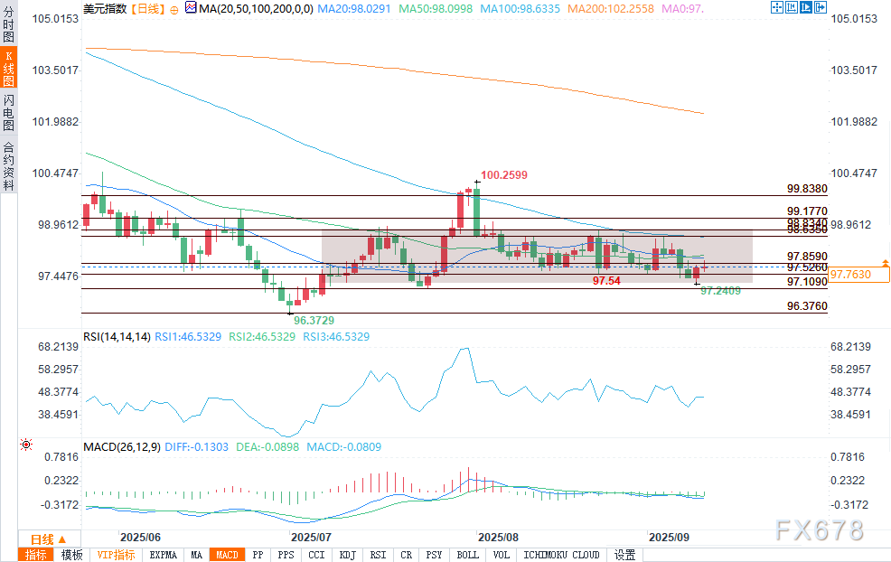 美元指数的即时支撑位为9月低点97.253。若能明确跌破该水平,可能进一步下探97.109;若消费者物价指数数据进一步强化“美联储将持续宽松”的预期,甚至可能跌至96.377区间。