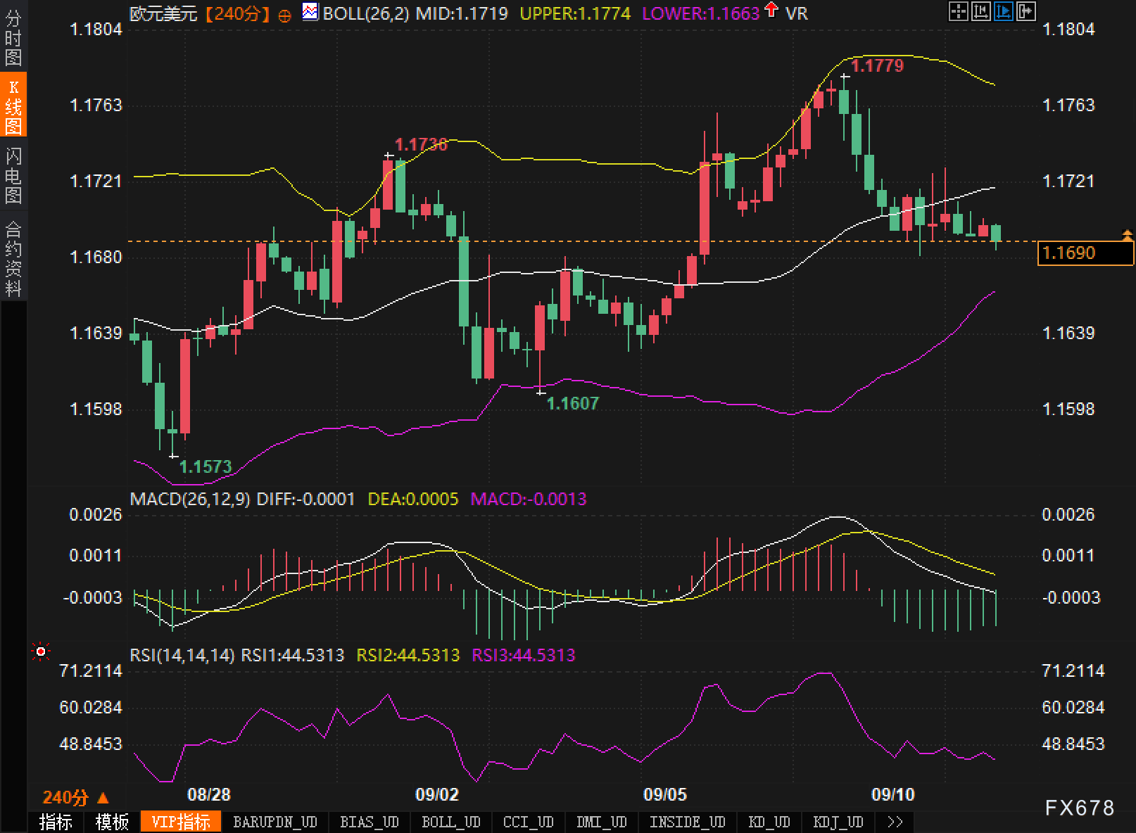 240分钟K线图上,布林带中轨1.1719,上轨1.1774,下轨1.1663;当前报价围绕1.1690,处于中轨下方、靠近前期震荡中枢。从K线结构观察,近几根蜡烛实体偏小、上下影线并存,振荡特征明显;中轨1.1719屡遭上影线测试而未收复,呈动态压力。