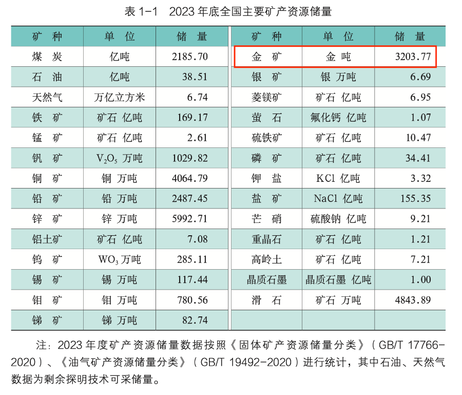 据今年2月底自然资源部发布的《2024年中国自然资源公报》,截至2023年底,我国金矿资源储量3203.77吨。