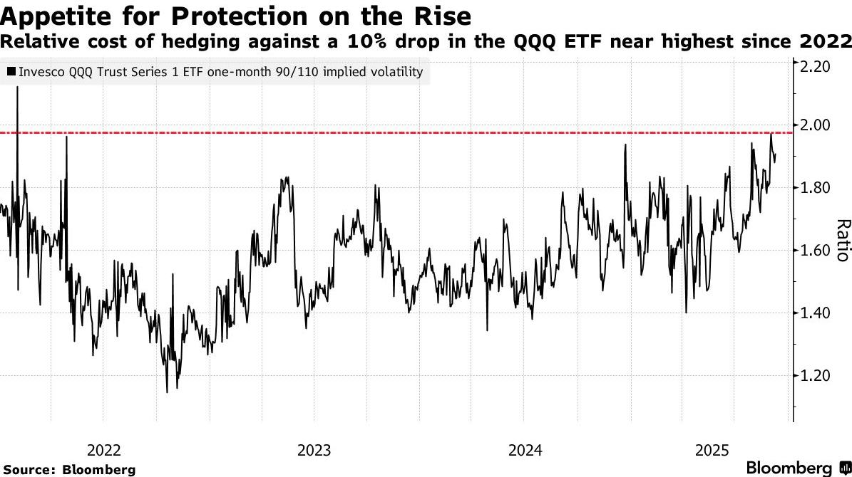 面对持续上涨,部分投资者选择通过看跌期权锁定年内收益。衡量Invesco QQQ Trust ETF(挂钩纳指100的最大ETF)未来一个月10%跌幅对冲成本的“保险价格”,相对于同等涨幅对冲成本的比例已升至2022年以来最高水平。