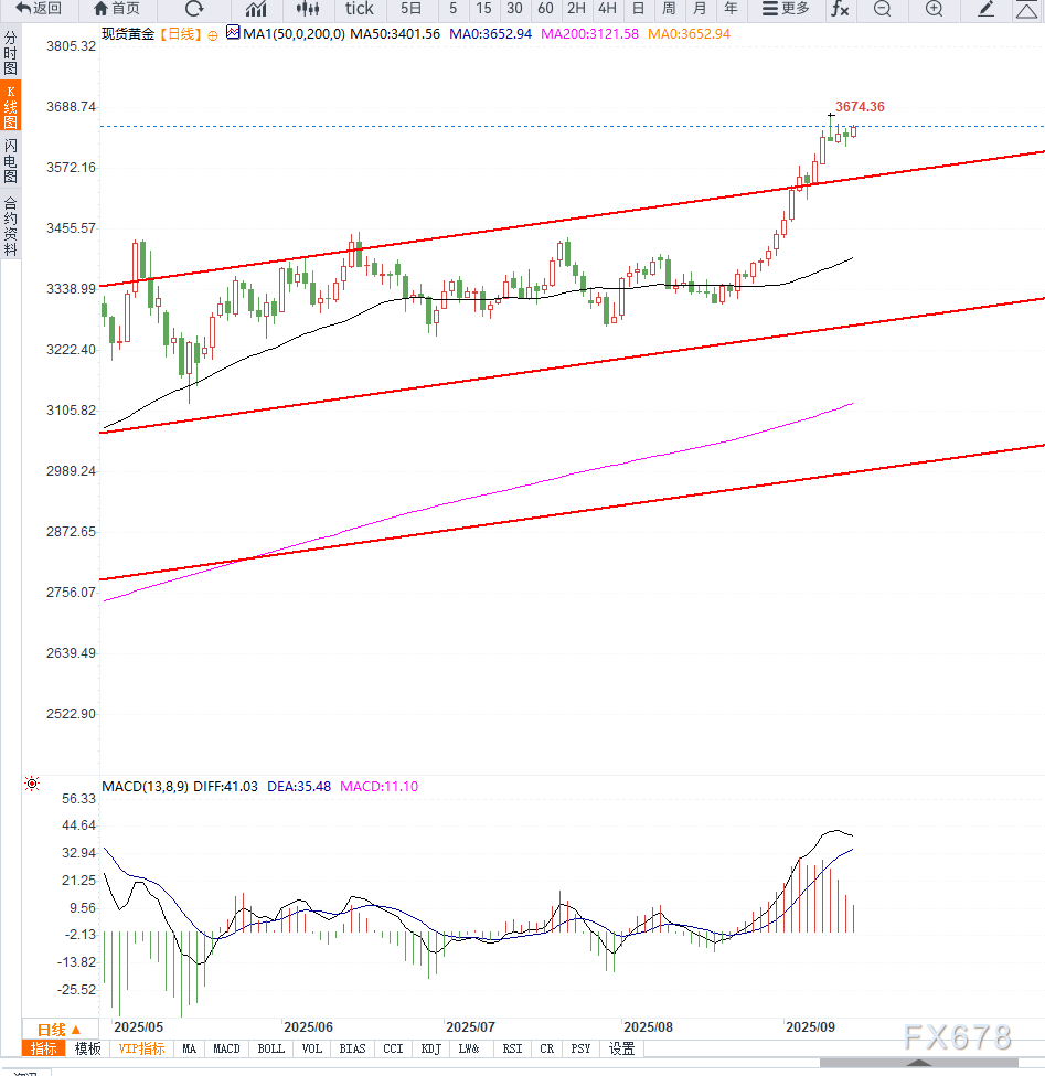 日线图显示,黄金的RSI指标处于超买区间,提示短线需警惕高位回调。若金价能突破并稳固在3658美元上方,则有望再次挑战3675美元历史高点,甚至冲击3700美元整数关口。