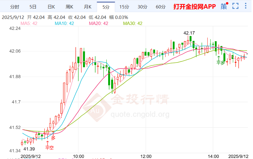今日周五(9月12日)欧盘时段,现货白银目前交投于41.86一线上方,今日开盘于41.54美元/盎司,截至发稿,现货白银暂报42.04美元/盎司,上涨1.16%,最高触及42.17美元/盎司,最低下探41.38美元/盎司,目前来看,现货白银盘内短线偏向看涨走势。