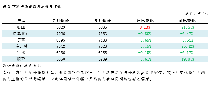 下游产品行情来看,9月MTBE受供应增量与出口疲软制约小幅承压,烷基化油因需求谨慎先弱后强,丁酮受益旺季备货震荡上行,顺酐则因装置减产或现阶段性反弹。