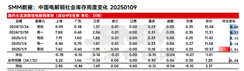 SMM全国主流地区铜库存周内下降 周度库存三联增