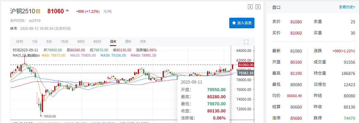 在上述因素共同作用下,铜价呈现显著上涨态势:截至9月12日15:59,伦铜上涨0.62%,报10114美元/吨,当周周线暂涨2.19%;沪铜上涨1.22%,报81060元/吨,周线实现三连涨,本周涨幅达1.4%。