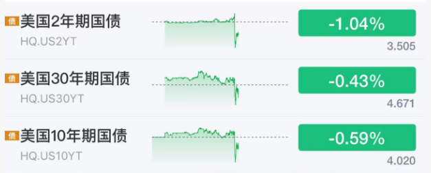 美国国债收益率走低。基准10年期美债收益率最新持平在4.02%,此前盘中一度触及4%;2年期收益率下跌至3.505%。