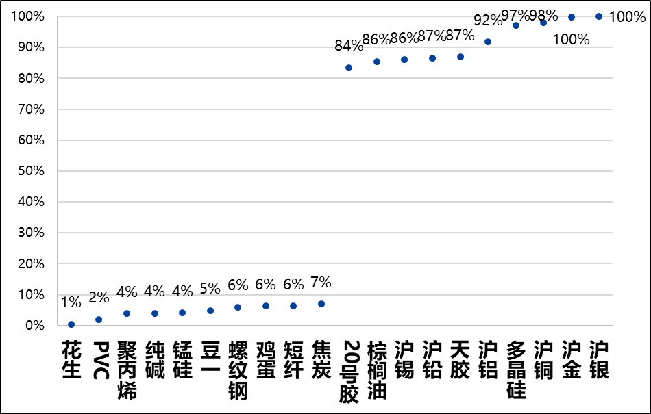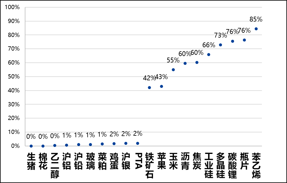 本周,贵金属、铜铝、多晶硅等品种的期货价格依然处于近5年最高水平。花生、PVC和聚丙烯等品种的期货价格处于近5年较低水平。波动率方面,苯乙烯、瓶片、碳酸锂等品种波动率位于近5年高位,生猪、棉花、乙二醇等品种波动率极低。