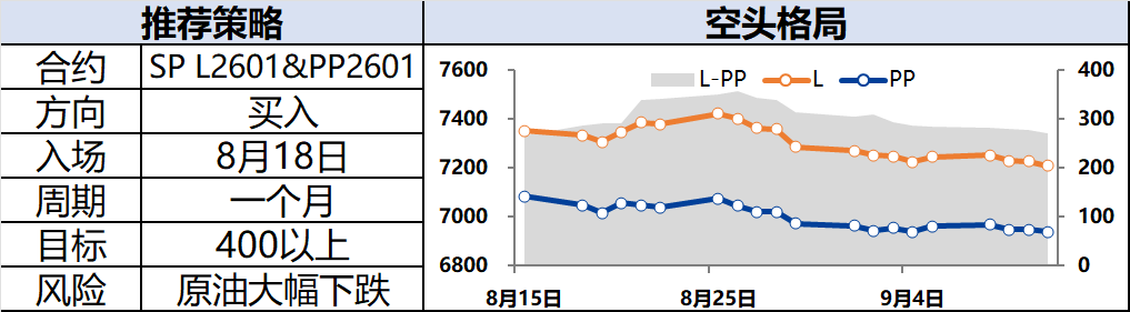 驱动:PE产量转而减少,供需维持平衡。PP产量接近历史最高,供应趋于宽松。PE强而PP弱格局不变。