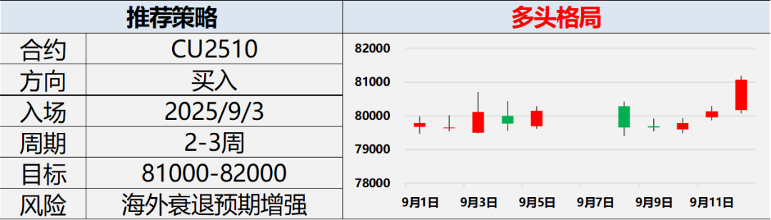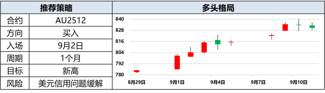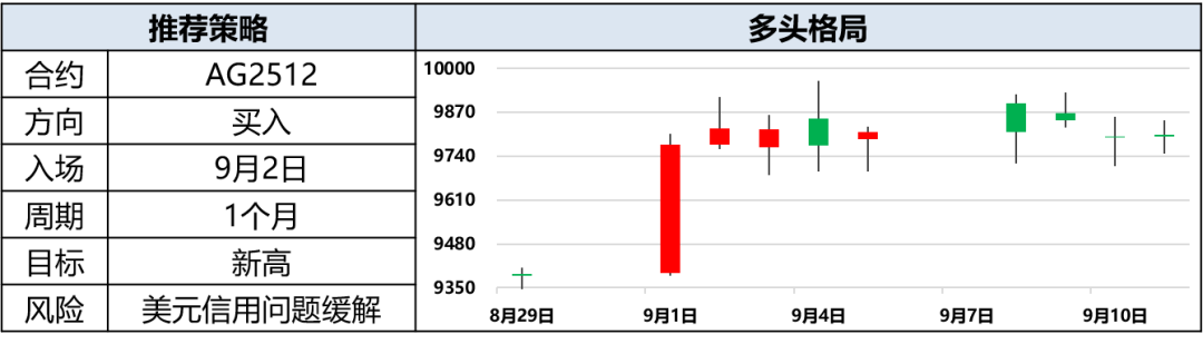 驱动:显著低于预期的就业数据以及符合预期的通胀数据夯实了美联储9月降息基础,同时也潜藏美国经济滞胀的风险,助力贵金属价格向上突破。目前市场关注重点已由美联储是否降息转向宽松幅度。如果美国经济数据成色较差,美联储或转向更为宽松的降息节奏。并且长期看,美联储独立性、美国政府债务可持续性担忧始终存在,美元信用下滑问题并未得到解决,金价长期上行的趋势未变。维持黄金多头思路。