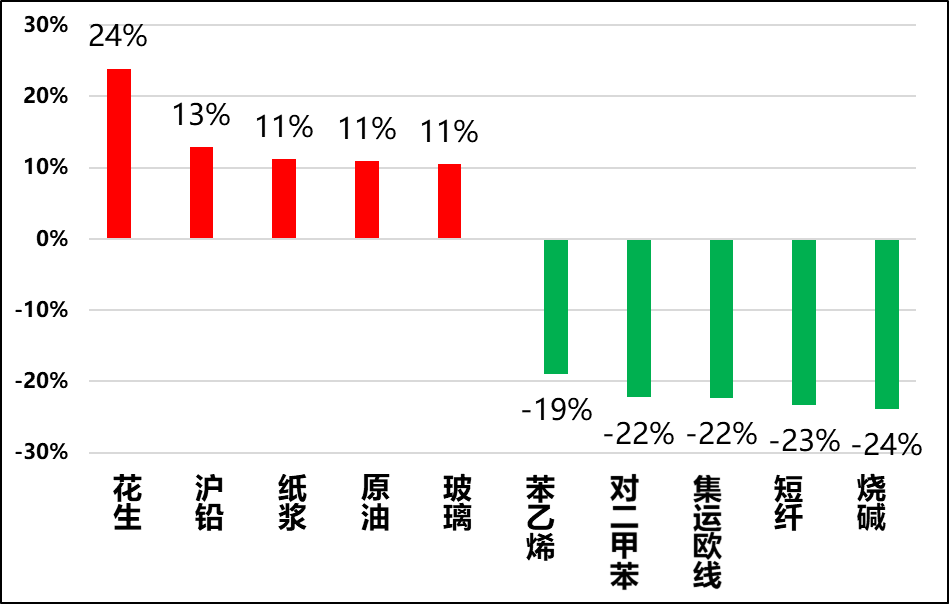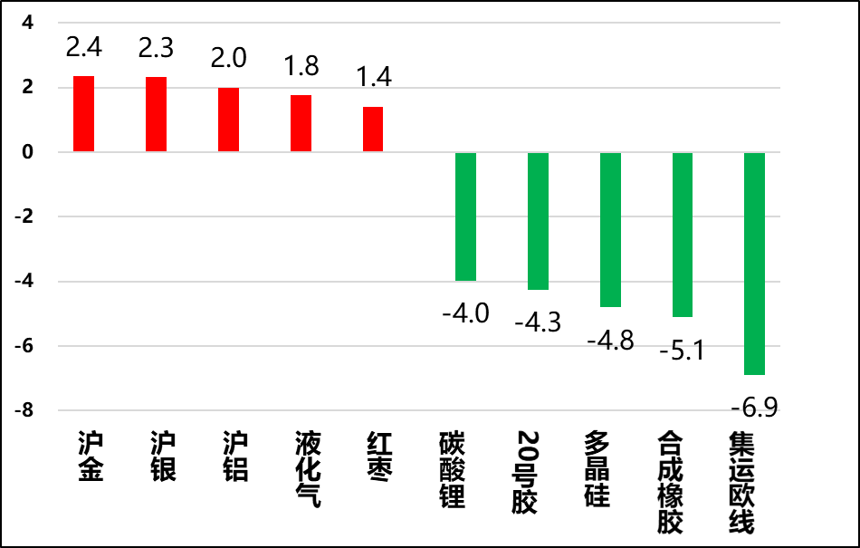 具体期货品种表现上,股指、金银、沪铝等品种涨幅居前,集运欧线、合成橡胶、多晶硅领跌市场。成交量方面,花生成交量环比增长24%,烧碱的成交量环比缩减24%。