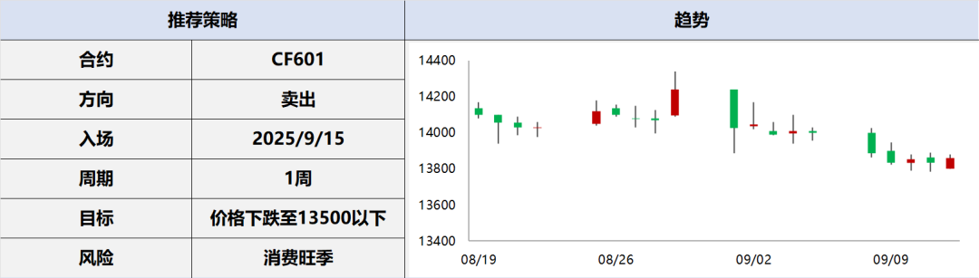 驱动:全疆棉花进入吐絮高峰期,平均吐絮率约47.5%,部分地区手摘棉已陆续采摘交售。新棉丰产预期较强。下游市场新订单回升缓慢,整体氛围偏淡,观望情绪较浓,原料补库按需采购。棉花整体基本面暂无利好驱动,价格或偏弱运行。