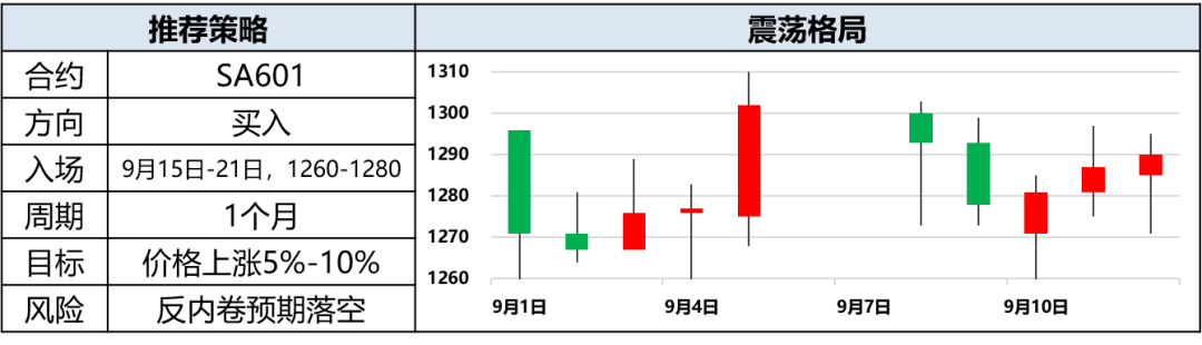 驱动:基本面变化不大。本周纯碱周产量进一步升至76.11万吨,周五日产为10.83万吨。9-10月检修计划较少,阿拉善二期稳步推进,纯碱供给易增难减,供过于求的压力依然存在。不过近几周在高供应背景下,碱厂累库速度慢于我们的预估。且纯碱盘面估值已跌至理论成本附近。在反内卷政策预期并未被证伪、煤价暂无进一步下跌动力的情况,纯碱估值对基本面存量利空定价已较充分。维持纯碱低位震荡格局的判断。